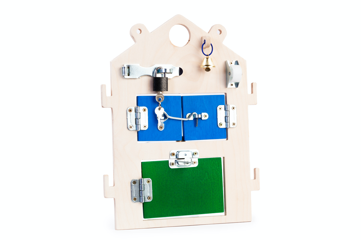 • Ahşap panonun üzerine kırılmayan ayna, oyuncak direksiyon, kapı açma mandalı, elektrik düğmesi ve kapı tokmağı gibi bebeğinizin hareket ettirip oynayabileceği nesneler vidalayın.