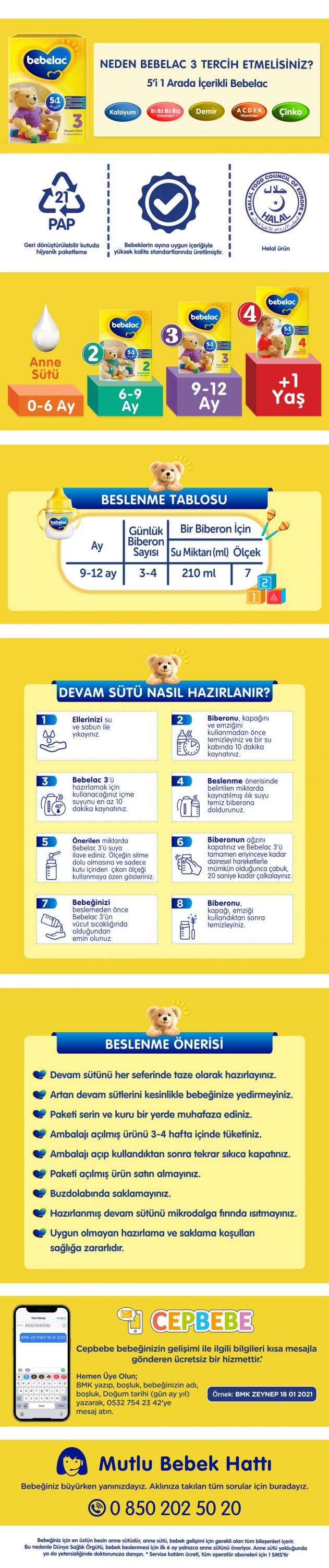 - Bebelac 3 Devam Sütü, anne sütü ile beslemenin mümkün olmadığı durumlarda doktor tavsiyesiyle 9. aydan itibaren kullanılabilir. *