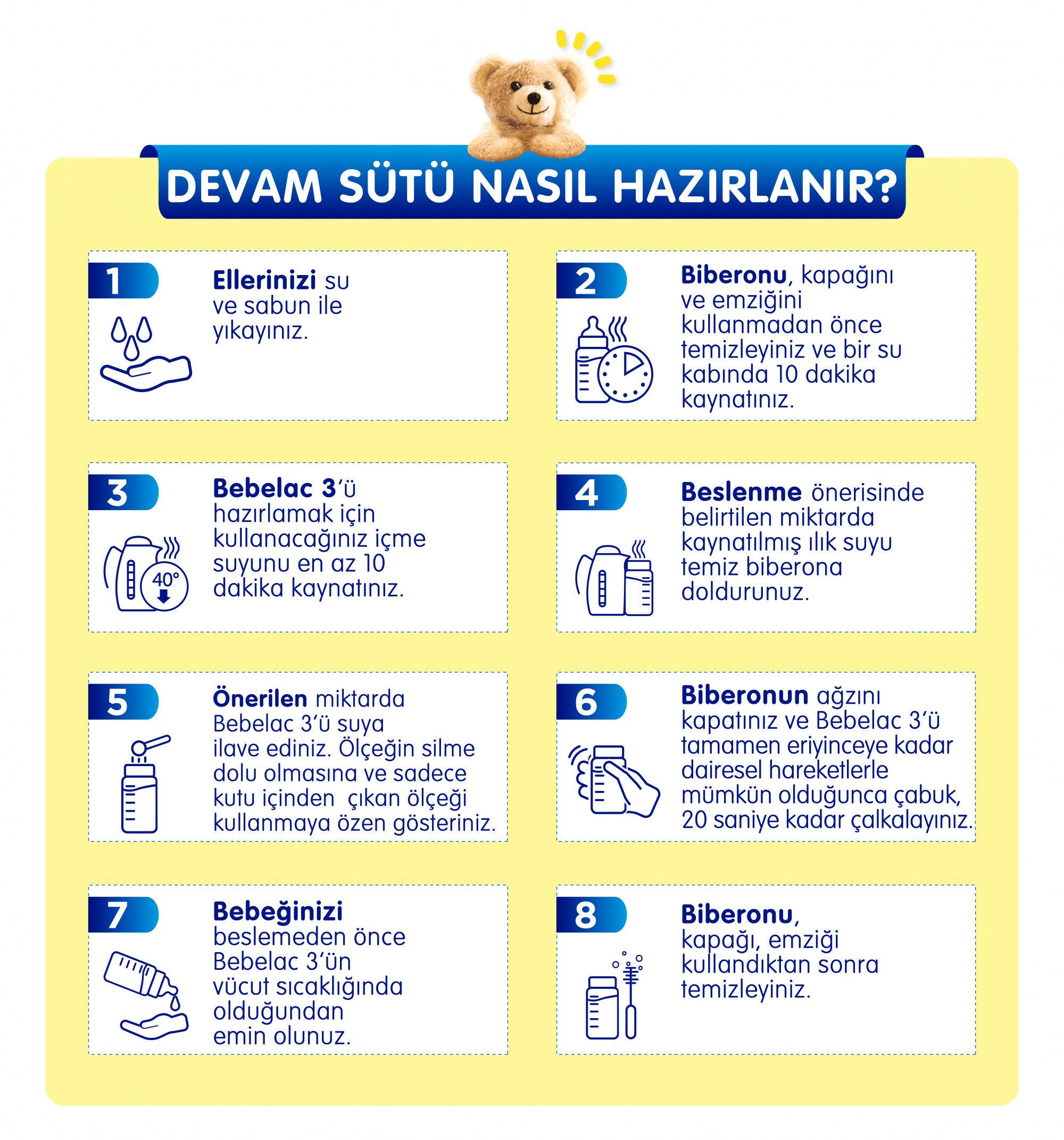 - 1 yaşından itibaren doktorunuzun önerisiyle Bebelac 4 Çocuk Devam Sütü ‘ne geçebilirsiniz.