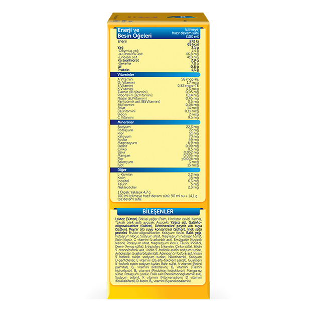 • 5’i 1 arada içerikli Bebelac Devam Sütleri C, D, B2, B5, K ve Biotin vitaminlerinden zengindir. Demir kaynağıdır.