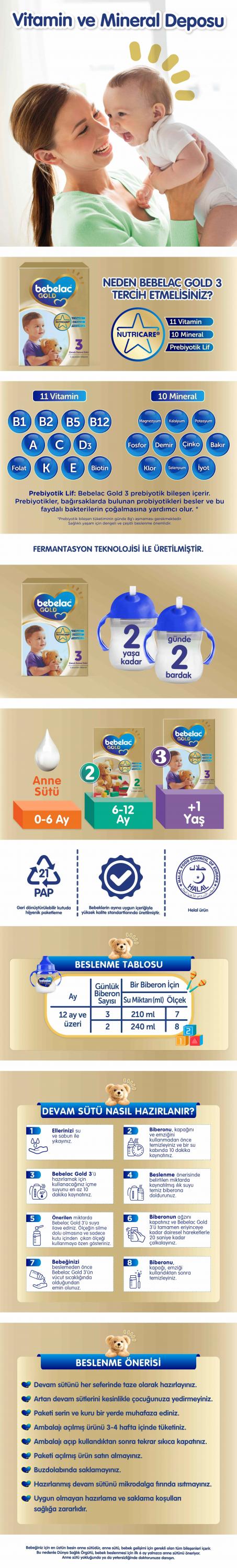 - B2, B5, B12 Vitaminleri ve Biotin, C Vitamini, A Vitamini, D3 Vitamini, E Vitamini ve K Vitamininden Zengin Bebelac Gold’u Bebeğinizin Ek Gıdalarına da Ekleyebilirsiniz.